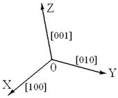Оси координат OX, OY, OZ имеют соответственно символы [100], [010], [001] (рис. 6.4, б). Здесь видно одно из основных преимуществ кристаллографической символики: символы осей координат не зависят от углов между осями координат и от осевых отрезков, они одинаковы в любой системе координат.