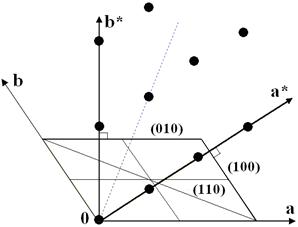 На рис. 6.6 представлен порядок построения обратной решетки. Из узла прямой решетки, выбранного как начало координат, проводится перпендикуляр к каждой плоскости с индексами (hkl). На линии перпендикуляра ставится точка на расстоянии 1/dhkl от начала координат. Таким образом, кристаллографические плоскости задаются как набор точек в обратном пространстве: каждой плоскости (hkl)прямой решетки отвечает в обратной решетке узел [[ hkl ]]*. Бесконечному семейству параллельных плоскостей { hkl }в пространстве прямой решетки соответствует в пространстве обратной решетки бесконечное семейство точек [[ hkl ]]* вдоль направления, нормального к этим плоскостям. Расстояния этих точек от точки 0, принятой за начало координат в обратном пространстве, равны 1/ d, 2/d, 3/d,..., где d = dhkl - расстояние между плоскостями { hkl }в прямой решетке.