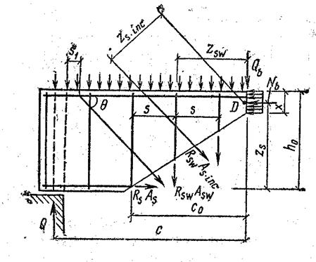 где: Q- поперечная сила в вершине наклонного сечения от действия опорной реакции и нагрузки, расположенной на участке от опоры до вершины наклонного сечения; Qb- поперечная сила, воспринимаемая бетоном. сжато и зоны над наклонным сечением; Qsw- сумма осевых усилии в поперечных стержнях (хомутах), пересекаемых наклонным сечением; Qs,inc - сумма проекций на нормаль к оси элемента осевых усилии в отгибах, пересекаемых наклонным сечением.