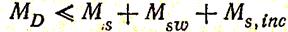 МD - изгибающий момент от нагрузки и опорной реакции балки (при их расчетном значении), действующих на рассматриваемом участке балки, взятый относительно точки D (след оси, проходящей через точку положения равнодействующей напряжений в сжатой зоне и перпендикулярной плоскости действия момента); Ms- сумма моментов от усилий в продольной арматуре относительно той же точки; Msw- сумма моментов от усилий в поперечных арматурных стержнях, пересекаемых наклонным сечением, относительно той же точки; Ms.inc- то же от усилий в отгибах.