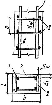 Диаметр поперечных стержней d в сварных каркасах должен удовлетворять условиям свариваемости. Диаметр хомутов вязаных каркасов принимают не менее 5 мм и не менее 0,25 d, где d- наибольший диаметр продольных стержней. Толщина защитного слоя поперечных стержней aw должна быть не менее 15 мм.