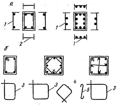 Рис.1.4.4.Армирование сжатых элементов со случайными эксцентриситетами: а- сварными каркасами; б- вязаными каркаса; 3- хомуты; 1- сварные каркасы; 2- соединительные стержни; 3- хомуты; 4 - дополнительные хомуты; 5- шпильки.