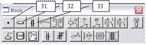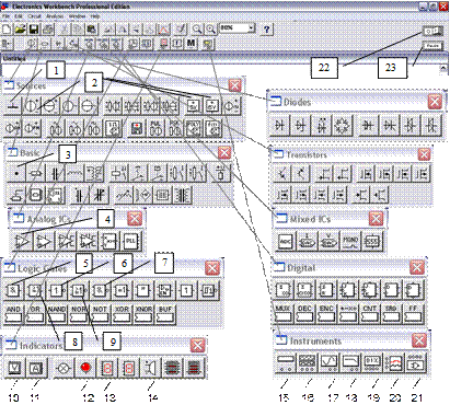 1 – общая шина; 2 – источники напряжения; 3 – точка присоединения; 4 – операционный усилитель; логические элементы: 5 – 2И, 6 – НЕ, 7 – 2И-НЕ, 8 – 2ИЛИ, 9 – 2ИЛИ-НЕ; 10 – вольтметр; 11 – амперметр; 12 – красный индикатор уровня; 13 – семисегментный индикатор; 14 – динамик; 15 – мультиметр; 16 – функциональный генератор; 17 – двухлучевой (двухвходовый) осциллограф; 18 – построитель амплитудно-частотных характеристик (bode plotter); 19 – генератор цифровых слов (кодов) (word generator); 20 – логический анализатор; 21 – логический преобразователь (конвертер) (Logic conventer); 22 – тумблер включения макета («ПУСК»); 23 – кнопка «ПАУЗА»