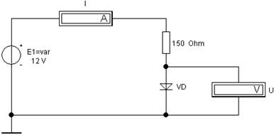 2.1. Для получения смоделированной в Workbench «экспериментальной» ВАХ собираем схему измерения с неавтоматизированным ручным изменением входного напряжения E 1=var.