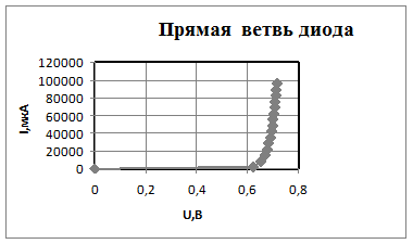 8 точках для каждой, получаем значения тока I и напряжения U на диоде. Результаты заносим в таблицу, по которой строим в Excel график с маркерами для «экспериментальной» ВАХ. Для примера на рисунке показана прямая ветвь «экспериментальной» ВАХ.