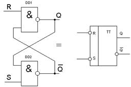 Один из входов триггера называется установочным входом и обозначается буквой S (от слова Set), а другой – входом сброса и обозначается буквой R (от слова Reset). Триггер имеет два симметричных выхода: прямой и инверсный.