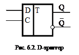 D-триггер имеет один информационный вход D, вход синхронизации С и два выхода прямой Q и инверсный