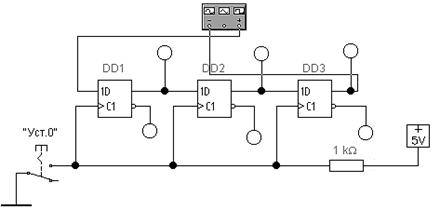 Если в начальный момент все триггеры счетчика находились в нулевом состоянии (можно установить кнопочным выключателем «Уст.0», подавая на R входы триггеров напряжение низкого уровня), по спаду первого импульса триггер DD1 переключится в единичное состояние – на его прямом выходе появится высокий уровень напряжения. Второй импульс переключит триггер DD1 в нулевое состояние, а триггер DD2 – в единичное. По спаду третьего импульса триггеры DD1 и DD2 окажутся в единичном состоянии, а триггер DD3 все еще будет в нулевом. Четвертый импульс переключит первых два триггера в нулевое состояние, а третий – в единичное. Восьмой импульс переключит все триггеры в нулевое состояние, начнется следующий цикл работы счетчика импульсов. Число различных состояний N-разрядного счетчика