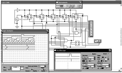 6.1. Составить принципиальную схему счетчика-делителя на N на базе D-триггеров или JK-триггеров для своего варианта работы.6.2. Смоделировать электрическую функциональную схему счетчика в среде Electronics Workbench. 6.3. Включить схему и, подавая на вход схемы тактовые импульсы, убедиться в правильности работы счетчика.6.4. Получить временные диаграммы входных и выходных сигналов для смоделированного счетчика с помощью логического анализатора Logic Analizer и двухлучевого осциллографа.Общие сведения и методические указания