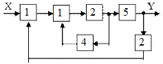 7.2. Для составления структурной схемы определяем вид обратной связи (отрицательная или положительная). Так как в цепи обратной связи 1-1-2-5-2 и 1-2-4 нечетное количество блоков с инвертирующими операционными усилителями (пять блоков и три блока соответственно), то это определяет отрицательные обратные связи (если бы было четное количество операционных усилителей, обратные связи были бы положительными). Тогда схему с учетом определения обратных связей, как отрицательных обратных связей, можно представить в виде