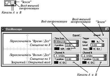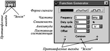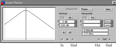 Предназначен для анализа АЧХ (при нажатой кнопке Magnitude) и ФЧХ (при нажатой кнопке Phase) в логарифмическом (кнопка Log) или линейном масштабе (Lin). Настройка заключается в выборе пределов измерения коэффициента передачи по вертикальной оси и вариации частоты по горизонтали (F – максимальное значение, I – минимальное) (не выше 100 Mhz в наших лабораторных работах!!!). Считывание показаний АФЧ–ФЧХ производится с помощью визирной линии, перемещаемой мышью или кнопками влево-вправо. Входы измерителя In, Out подключаются ко выходу и выходу исследуемого устройства соответственно.