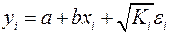 Как и раньше, будем предполагать, что среднее значение остаточных величин равно нулю. А вот дисперсия их не остается неизменной для разных значений фактора, а пропорциональна величине