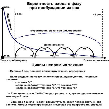 Например, целиком все это может выглядеть следующим образом: фазер ложиться спать в 23.30 и заводит будильник на 6.00; в 6.00 он просыпается по будильнику, ходит в туалет, пьет воду, вспоминает непрямые техники, а также свой интересный план действий в фазе (например, посмотреть в зеркало и слетать на Марс); в 6.05 фазер снова ложиться спать с четким намерением на каждом следующем пробуждении попасть в фазу; в 7.35 (например) фазер неожиданно просыпается и моментально пробует тут же разделиться с телом; не сумев разделиться за 3-5 секунд, фазер начинает пытаться делать вращение, но оно тоже не работает за 3-5 секунд; фазер делает технику плавания, но она не работает за 3-5 секунд; фазер делает фантомное раскачивание, но и оно не работает за 3-5 секунд; фазер снова делает вращение, технику плавания и фантомное раскачивание по 3-5 секунд; затем он снова делает вращение, плавание и фантомное раскачивание по 3-5 секунд; на четвертом цикле он начинает делать вращение и оно неожиданно начинает получаться – возникает ощущение вращения; фазер останавливается на технике, раскручивается как можно сильней и тут же выкатывается из тела вращаемым ощущаемым телом; он тут же бежит к зеркалу, при этом он все вокруг активно ощупывает и разглядывает с близкого расстояния, отчего его ощущения становятся яркими; посмотрев в зеркало, практик применяет технику перемещения и оказывается на Марсе, но его неожиданно возвращает в тело; фазер тут же пробует снова выйти из тела, но у него не получается; он снова засыпает с четким намерением на следующем пробуждении повторить попытку и побольше побыть на Марсе; и т.д.