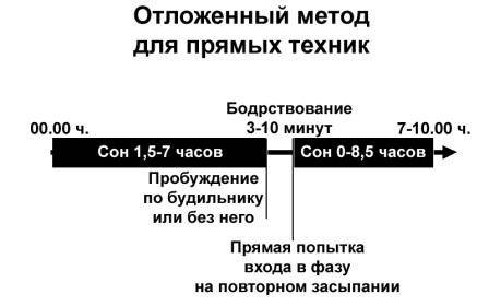Естественно, самый лучший момент для осуществления прямых техник такой же, как и при непрямых техниках – отложенный метод. Но с некоторыми серьезными отличиями. Во-первых, прервать сон можно практически в любое время ночи и раннего утра. Во-вторых, после фиксирования пробуждения не нужно засыпать, а нужно сразу приступать к техникам. При отложенном методе прямые техники эффективней любого другого времени в несколько раз. И все это потому, что мозг во время него еще не успевает прийти в 100% бодрствование и еще сам легко проваливается в измененные состояния сознания, на волне чего можно получить результаты.