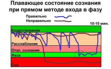 При плавающем состоянии сознания попадание в фазу происходит чаще всего благодаря трем основным моментам. Во-первых, на фоне провала может начать хорошо работать какая-то техника. Во-вторых, после провала неожиданно ярко может начать проявляться близость фазы через шум или вибрации. В этот момент можно тут же переключаться на соответствующие им техники: прислушивание и напряжение мозга, которое только в таком случае и может быть применено в отношении прямых техник. В-третьих, на фоне выхода из провала бывает достаточно легко просто разделиться или быстро по предварительным признакам нащупать какую-либо работающую технику.