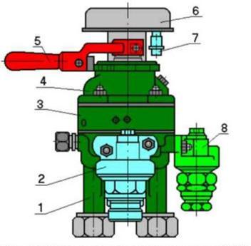 Верхняя часть (рис.8.2) крана состоит из крышки7, золотника 6 и стержня4. На стержень надета ручка2 и закреплена винтом, а сверху прижата к крышке гайкой1. Стержень в крышке уплотнён манжетой 20, которая упирается в стальную фасонную шайбу. Вместо стальной шайбы применяется шайба из полиэтилена диаметром 45X24 мм и высота 3 мм. В настоящее время ручку крана машиниста вместо ковкого чугуна изготавливают из пресс-материала АГ-4В.