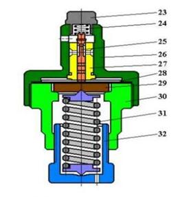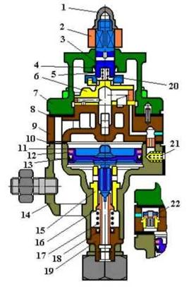 Редуктор (рис 8.3)состоит из корпуса26, верхней части с запрессованным седлом и корпуса 30 нижней части. В верхней части находится возбудительный клапан 25, прижимаемый к седлу пружиной 24 с силой 3 кгс, которая другим концом упирается в заглушку 23. На металлическую мембрану 28(диаметром 78 мм) снизу через опорную шайбу29 действует пружина31, упирающаяся через центрирующую шайбу в упорку32. Силу рабочей пружины 31 регулируют вращением упорки 32, один оборот изменяет давление в уравнительном резервуаре на 1,5кгс/см2.