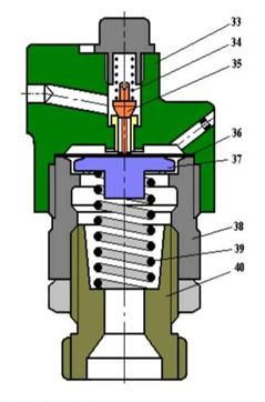 Стабилизатор (рис 8.4), служащий для ликвидации сверхзарядки магистрали при поездном положении ручки крана, состоит из корпуса33, в который запрессована втулка, гайки, клапана35, прижатого к седлу пружиной34, помещённой в заглушке. В корпус запрессован ниппель с калиброванным отверстием диаметром 0,45 мм. Снизу на мембрану диаметром 55 мм через упорную шайбу37 действует пружина39, регулируемая винтом с контрагайкой40.
