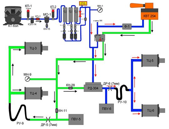 Из магистрали через кран КН11 и дроссельную шайбу ДР-5 диаметром 7 мм, резиновый рукав РУ-9 поступает в ТЦ-3, ТЦ-4 первой тележки и через разобщительный кран КН28 заполняет фиктивный объем (камеру над диафрагмой) РД 304-002. диафрагма прогибается вниз и открывает впускной клапан, который сообщает главные резервуары с тормозными цилиндрами ТЦ-5 и ТЦ-6 через редуктор КР-3 отрегулированный на 5 ат, дроссельную шайбу ДР-6, резиновый рукав РУ-10. То есть наполнение ТЦ второй тележки осуществляется через реле давления 304 прямо из главных резервуаров, чем достигается быстрое наполнений ТЦ.