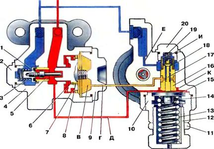 Когда давление в полости К окажется достаточным для преодоления усилия пружины 13, диафрагма займет среднееположение. Клапан 17 под действием пружины 19 прижмется к седлу 16 и разобщит полости И и В.