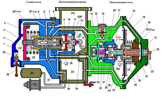 Двухкамерный резервуар содержит фильтр 34, рабочую (РК) и золотниковую (ЗК) камеры, к нему подведены трубопроводы от тормозной магистрали (ТМ) через разобщительный кран, запасного резервуара (ЗР) и тормозного цилиндра (ТЦ). На корпусе 36 двухкамерного резервуара расположена рукоятка переключателя режимов торможения (на рисунке не показана): порожнего, среднего и груженого. На двухкамерный резервуар крепятся главная и магистральная части, в которых сосредоточены все рабочие узлы прибора.