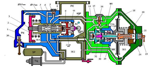 При быстром темпе повышения давления в ТМ в голове поезда магистральная диафрагма прогибается вправо до упора диском 19 в седло 20. Клапан дополнительной разрядки закрывается. Воздух из РК через два отверстия диаметром по 1 мм в хвостовике левого диска 27 и осевой и радиальный каналы плунжера 21 перетекает в полость «П», а из нее - в ЗК. Рост давления в ЗК вызывает перемещение главного поршня в отпускное положение и. следовательно, опорожнение ТЦ в атмосферу.