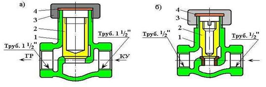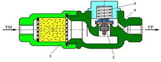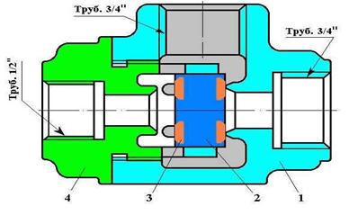 крышки 4 и собственно клапана 2 с двумя прокладками 3. Корпус имеет два отростка с резьбой ¾"для присоединения к ТЦ и КВТ. В крышке имеется один отросток с резьбой ½" для подключения трубопровода от воздухораспределителя (ВР).
