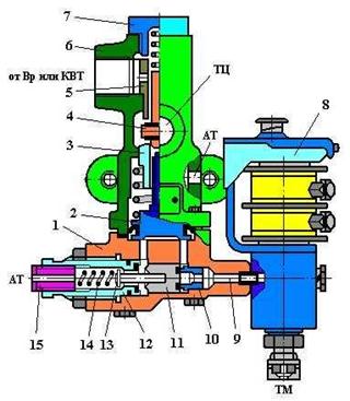 При этом понижается давление и под поршнем 2. При падении давления в ТМ приблизительно до 2,5 – 2,7 кгс/см2 переключательный клапан 11 под действием пружины 14 переместится толкателем 13 до упора вправо, перекрывая канал 9. Воздух из полости под поршнем 2 выходит в атмосферу Ат1 через осевой канал регулировочного винта 15 и поршень опускается под действием своей пружины. При этом переключательный клапан 4 своей пружиной опускается на нижнее седло 3, разобщая ТЦ от атмосферы Ат1 и сообщая их с воздухораспределителем. Происходит замещение электрического торможения пневматическим.