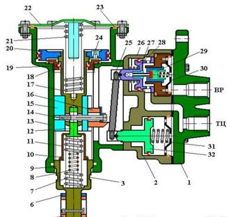 Хвостовики поршней 27 и 32 опираются на рычаг 25, а осью поворота рычага является сухарь 16.