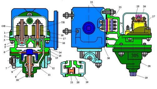 На ярме 27 закреплен диод 25. Провода от катушек и диода выведены на зажимы колодки 24, которая соединена с контактной колодкой 23, укрепленной на фланце корпуса электрической части. Колодка 22 крепится к фланцу рабочей камеры. Обе колодки имеют по три зажима и по три электрических контакта. В схеме двухпроводного ЭПТ используется только по одному зажиму и одному контакту.