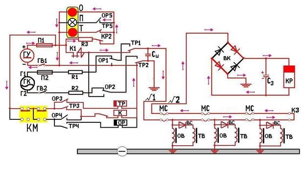 При постановке ручки крана машиниста в положения VА, V и VI по рабочему и контрольному проводу протекает постоянный ток(рис.19.4). При этом + рабочий провод, а – рельс. Оба вентиля ЭВР получают питание и их якоря притягиваются к сердечникам. При этом отпускной клапан закрывает осевой канал ОВ, разобщая РК от атмосферы, а тормозной клапан открывает отверстие диаметром 1,8 мм, сообщая полость над диафрагмой 13 и рабочую камеру с запасным резервуаром. Сжатый воздух из ЗР начинает перетекать в РК. Диафрагма 13 прогибается вниз, закрывает выпускным клапаном атмосферный канал в штоке 8 и открывает питательный клапан 9. Воздух из ЗР поступает в полость под диафрагмой и далее к переключательному клапану 21, перемещает последний до упора вправо и проходит в ТЦ.