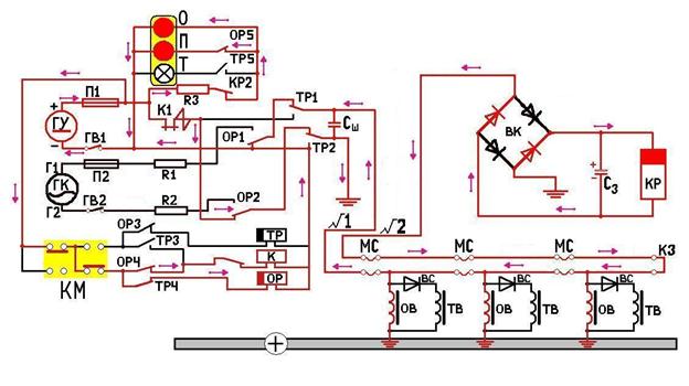 9. Обрыв проводов ЭПТ. Наиболее вероятным местом обрыва является межвагонное соединение между головками рукавов. Для повышения надежности используют дублированное питание между рабочим и контрольным проводом с постановкой тумблера включения и выключения питания. При включенном дублированном питании ток в линейные провода подается параллельно и тормоз не теряет работоспособность при обрыве рабочего провода в одном месте или обрывах контрольного провода. Недостаток дублированного питания – отсутствие контроля целостности линейных проводов, так как контрольное реле блока управления ЭПТ даже в случае одновременного обрыва двух проводов (то есть при отказе ЭПТ) через дублированное питание останется включенным и на пульте продолжает гореть лампа «О», ложно сигнализируя о целостности линейных проводов. Для контроля электрических цепей на пульте управления локомотивом устанавливают амперметр, по которому фиксируют потребляемый ток в режимах «перекрыша» и «торможение». Уменьшение тока в режиме «перекрыша» от показания, которое было при опробовании тормозов, объясняется увеличением общего сопротивления электрической цепи при обрыве двух линейных проводов, так как количество параллельно включенных резисторов (ЭВР) в этом случае становится меньше. Дублированное питание используют при скорости до 120 км/час включительно, так как безопасность движения обеспечивается автоматическими тормозами и нормативы по тормозам при такой скорости не зависят от их типа. В настоящее время может использоваться измененная схема дублированного питания, которая при 1-м - 2-м положениях ручки КМ в работу не включена и в случае обрыва цепи на пульте погаснет сигнальная лампа «О». Включается дублированное питание автоматически при обрыве цепи и нахождении ручки КМ в 3-е – 6-е положениях. На локомотивах с такой схемой тумблер дублированного питания не устанавливают.