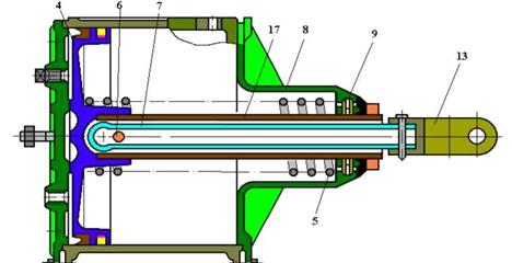 Тормозной цилиндр усл.№ 507 Б (рис.21.2) имеет самоустанавливающийся шток 7, шарнирно связанный с поршнем 4 и помещенный в направляющую трубу 16. головка 13 штока закреплена не на трубе, как у тормозного цилиндра усл№ 188 Б, а на штоке 7. зазор между штоком и стенками трубы позволяет головке 13 при торможении двигаться по дуге. Тормозные цилиндры с самоустанавливающимся штоком применяются на локомотивах. На электровозе ВЛ80 применяется тормозной цилиндр усл.№ 507 Б диаметром 254 мм (10 дюймов) и максимальным ходом поршня 240 мм.