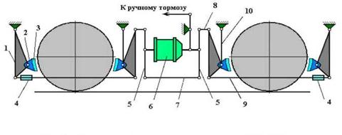 тормозных цилиндров усилия передаются на балансиры 5, связанные тягой 7 в нижних точках. Верхние концы балансиров 5 через серьги 8 передают усилие на подвески 1 и внутренние тормозные колодки и далее посредством тяг 9 на наружные подвески и тормозные колодки 3. Тормозные колодки 3 при помощи чек крепятся к башмакам 2, которые соединены с подвесками 1. Наружные подвески 1 прикреплены к концевым брусьям рамы тележки, а внутренние подвески соединены валиком с подвесками 10, присоединенными к кронштейнам на боковине рамы тележки. Через фигурные вырезы в нижней части подвесок проходят тормозные балки, соединенные попарно тягами 9, расположенными с внешней стороны каждой колесной пары. Тормозные балки, подвески 1, тяги 7 застрахованы от падения на путь при их обрыве тросами. Тросы закреплены на кронштейнах рамы тележки и на тормозном цилиндре. Для предохранения от обрыва длина тросов должна быть на 20 - 25 мм больше расстояния между точками их крепления. Шарнирные соединения рычажной системы выполнены посредством валиков, поверхность которых закалена на глубину 2 - 4 мм и втулок из высокомарганцовистой стали, запрессованных в отверстия сопрягаемых деталей. Выход штока тормозного цилиндра регулируется изменением длины тяги 9 при вращении муфты 4. Когда возможности регулировки выхода штока тормозного цилиндра посредством муфты 4 исчерпана ступенчатое регулирование осуществляется перестановкой валиков в последующие отверстия этих тяг. Зазоры между колодками и бандажом по концам каждой колесной пары регулируются разворотом колодок на валиках при помощи пружин и упорных болтов. Предельное значение разности зазоров не должно превышать 5 мм, причем больший зазор должен быть на нижнем конце колодки.