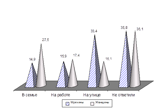 Как видно на рисунке 4.3, мужчину наибольший риск насилия подстерегает на улице, где потерпел моральный и физический ущерб каждый третий (33,4%) опрошенный представитель «сильного» пола. А вот для женщины опасно бывать в собственной семье, где испытали боль, обиду и унижение 27,5% хранительниц домашнего очага.