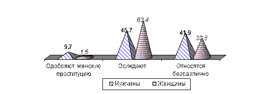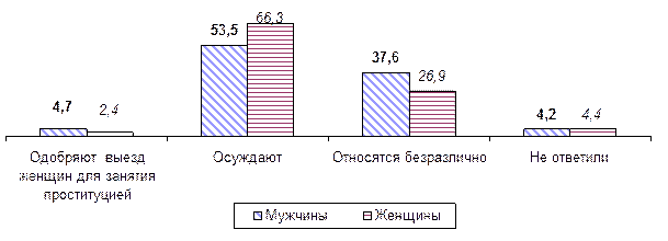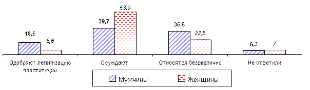 Как видим, каждый десятый мужчина всё же одобряет проституирование женщин. Ещё почти 42 % опрошенных представителей «сильного» пола не проявили никаких эмоций по этой проблеме.