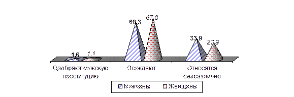 Если по отношению к женской проституции мнение полов было не совсем однозначным, то проституция мужская, как показали результаты опроса, одинаково претит как мужчинам, так и женщинам (рис. 4.16).