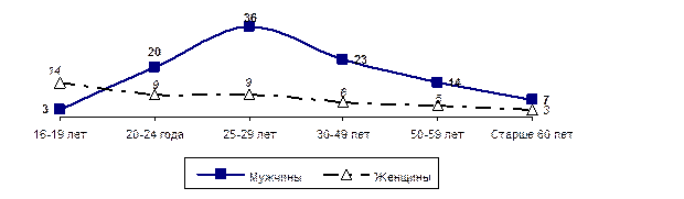 Рисунок 4.18 - Распределение мужчин и женщин, одобряющих легализацию проституции, в зависимости от возраста, в %.
