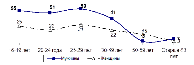 Как видно на графике, мстительность больше присуща молодости, постепенно убывая к старости. Причём, женщины оказались не меньшими мстительницами, чем мужчины. А среди девушек от 16 до 19 лет последовательниц Медеи даже больше, чем среди мужчин - мстителей. Резкое снижение мстительности женщин в возрастном диапазоне от 20 до 24 лет попытаемся объяснить периодом влюблённости в самом начале супружеской жизни.