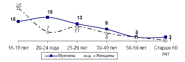 Ветхозаветный принцип «око за око», давая сдачи обидчику, применяет в жизни более трети (36,3%) мужчин и почти пятая часть (18,3%) женщин. Более подробная половозрастная дифференциация наших земляков, отвечающих насилием на насилие, показана на рис. 4.28.
