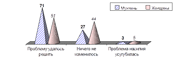 Результаты опроса показывают, что почти три четверти мужчин и половина женщин свои проблемы, связанные с насилием, успешно решили, применив адекватные меры воздействия. Для 27% представителей сильного пола и 44% женщин проблемы насилия после их реагирования остались без изменения. А 3% мужчин и 5% женщин явно ошиблись с выбором методов воздействия на насильника, потому что ситуация после этого только ухудшилась.