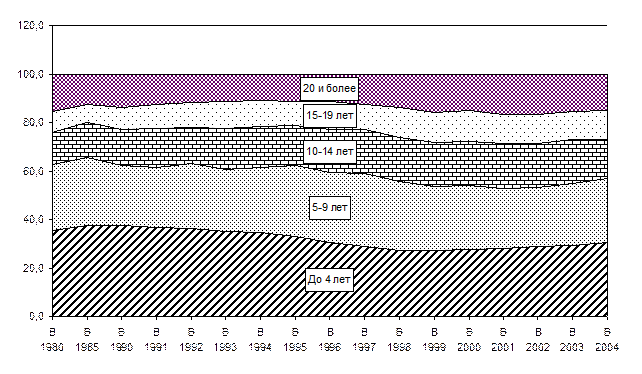 На рисунке 5.3 хорошо виден долевой вклад в общий бракоразводный процесс супругов с различным стажем семейной жизни. Поясним лишь, что, например, в 2004 году среди всех распавшихся браков 30,6% не просуществовали и четырёх лет, каждая четвёртая пара (26, 2%) прожила вместе от 5 до 9 лет. 16,4% расставшихся супругов были вместе от 10 до 14 лет. Каждая десятая (11,9%) пара имела на момент развода супружеский стаж от 15 до 19 лет. А 15,0% от общего количества расставшихся супругов прожили вместе более 20 лет и их можно было бы зачислить в супружеские старожилы, но они упустили шанс отпраздновать серебряную свадьбу.