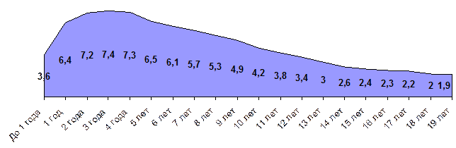 Рисунок 5.4 - Разводы по Могилёвской области по продолжительности расторгнутого брака, в среднем с 1980 года (на 1000 человек населения)
