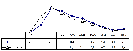 Рисунок 5.5 - Возраст мужчин и женщин, расторгнувших брак в 2004 году (в процентах от всех расторгнувших брак в этом году)