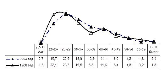 Рисунок 5.7 - Возраст женщин, разводившихся в 1980 году и в 2004 году (в процентах от всех женщин, расторгнувших брак в соответствующем году)