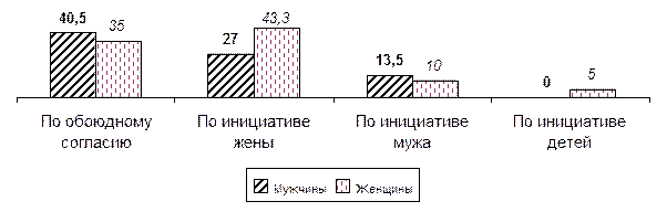 На рисунке хорошо видно, что ответы мужчин и женщин существенным образом различаются. Женщины чаще всего (в 43 случаях из 100) считают инициаторами развода себя, с чем согласны лишь 27% мужей. Мужчины же больше (40,5%) склоняются к обоюдному согласию, с чем согласилась лишь одна из каждых троих опрошенных женщин. Бракоразводную инициативу мужчинам отдало абсолютное меньшинство разводящихся супругов: только одна из десяти женщин и всего 13,5% самих мужей. В этом видится строгая закономерность: ведь именно женщины чаще всего определяют выбор брачного партнёра, многие из них доминируют при решении домашних, бытовых дел, они же подводят и окончательную черту под неудавшимся супружеским опытом.