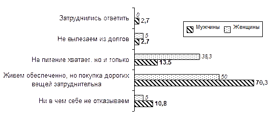 На рисунке хорошо видно, что разводящиеся мужья заметно выше, чем их жёны, оценивают свои успехи в материальном обеспечении семьи накануне развода. Они в два раза чаще своих жён ни в чём себе не отказывали. Живущих обеспеченно разводящихся мужчин оказалось почти в полтора раза больше, чем материально обеспеченных женщин. Не лишним будет в этой связи заметить, что мы старались опрашивать разводящиеся пары, поэтому речь здесь идёт, как правило, об одних и тех же семьях. Следовательно, налицо явные гендерные различия в материально-бытовой ситуации в семьях накануне развода. Мужчины, на плечах которых, согласно устоявшейся традиции, лежит обязанность материального обеспечения семьи, склонны завышать свои успехи на этом поприще. А женщины, сопоставляя свои материально-бытовые потребности с возможностями супруга, чаще всего остаются неудовлетворёнными.