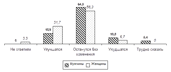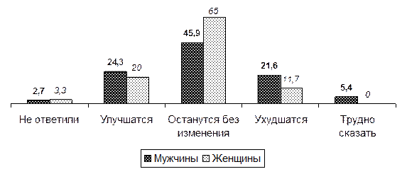 Рисунок 5.38 - Распределение ответов разводящихся мужчин и женщин на вопрос: «Как изменятся Ваши материальные условия после развода?», в %