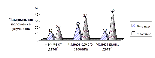 Женщины, имеющие на своём иждивении двоих детей, после развода надеются на улучшение свого материального положения в два с лишним раза чаще по сравнению с бездетными женщинами (45% и 20%, соответственно). Столь неожиданный факт требует более подробного рассмотрения. На чём основаны надежды многодетных женщин на улучшение материального положения после развода? Первая из обнаруженных нами причин может быть сформулирована так: в результате развода некоторые женщины попросту избавляются от мужей, которые не выполняют должным образом функцию кормильца, однако исправно кормящихся за семейным столом. В качестве подтверждения этого вывода приведём следующий факт социологического анализа: надеется на улучшение материального положения практически каждая вторая (47%) женщина, указавшая в качестве причины развода материальные трудности по вине мужа. Второй веский повод для оптимизма разводящихся женщин основывается на их реальных ожиданиях образовать новую семью с более дееспособным мужчиной. Если женщина оценивает свои шансы образовать новую семью как стопроцентные, её оптимизм относительно материально обеспеченного будущего возрастает до 67%. В том же случае, если таких шансов почти нет, надежда на материальное благополучие остаётся только у одной из десяти разводящихся женщин.