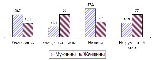 Разводящиеся женщины, в отличие от мужчин, настроены на создание новых супружеских союзов менее радикально. Они реже мужчин нестерпимо хотят замуж и сравнительно реже нетерпимо не хотят сочетаться новым браком. Но в целом, если учесть и страстно желающих замуж и желающих, но не очень, то практически каждая вторая (48,3%) из числа разводящихся женщин хотела бы образовать новую семью. Радикальной противницей старых проблем с новым мужем оказалась лишь одна из каждых пяти (20%) опрошенных разводящихся женщин. Да ещё примерно треть (30%) из них пока не думает об этом.